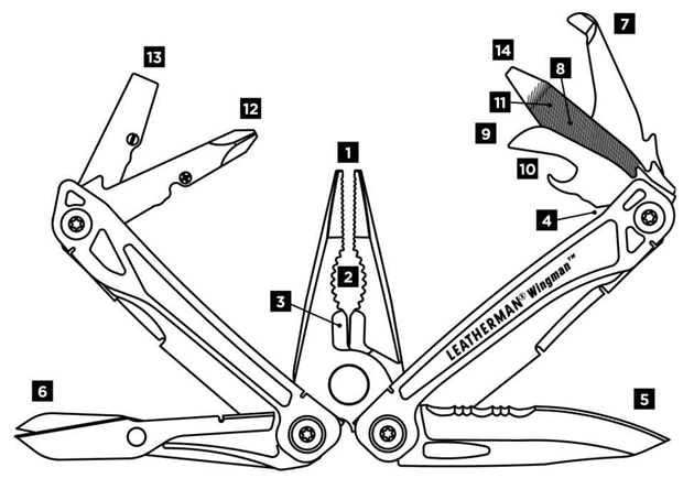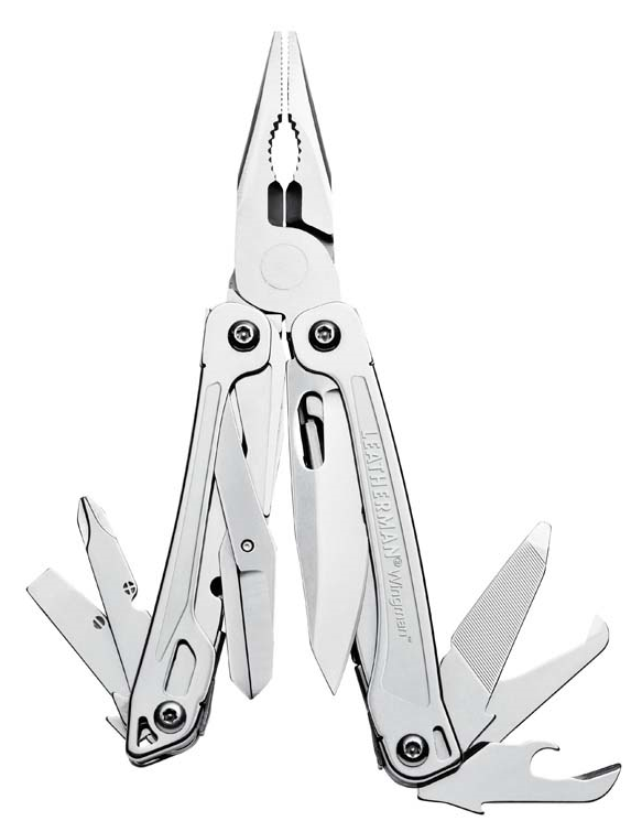 The Leatherman Wingman is just that: your go-to tool for projects around the house, on the job, or at the campsite. A great, lightweight pocket-sized, stainless steel tool; the Wingman features an outside-accessible, one-hand opening blade and newly-designed spring-action jaws.