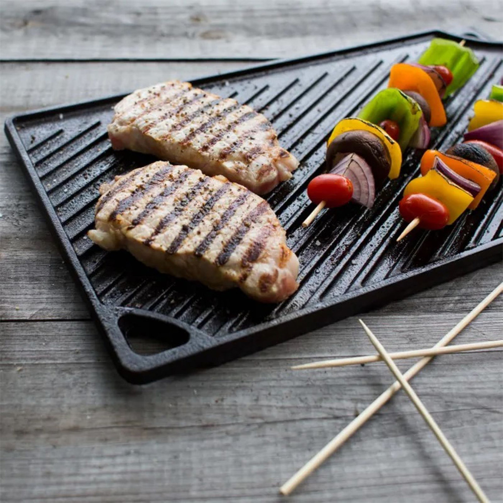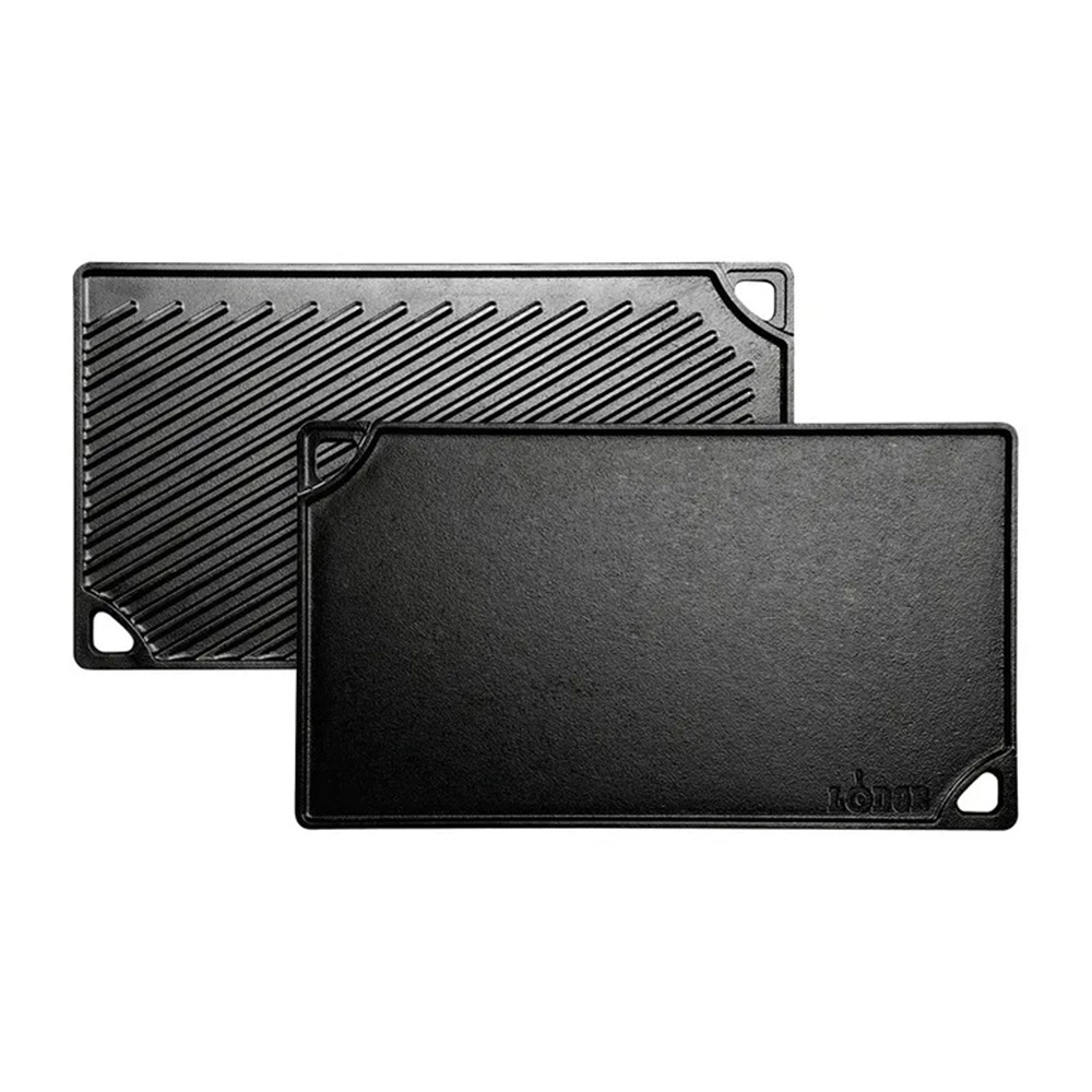 The Lodge two burner reversible griddle features a reversible grilling surface for both flat and ribbed indoor and outdoor grilling. Great for grilled cheese sandwiches, eggs and pancakes and the ribbed side is perfect for grilling foods such as steak, fish, chicken and hamburgers.